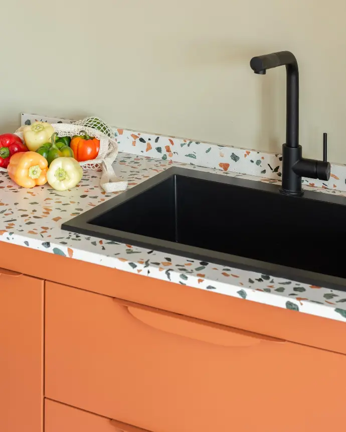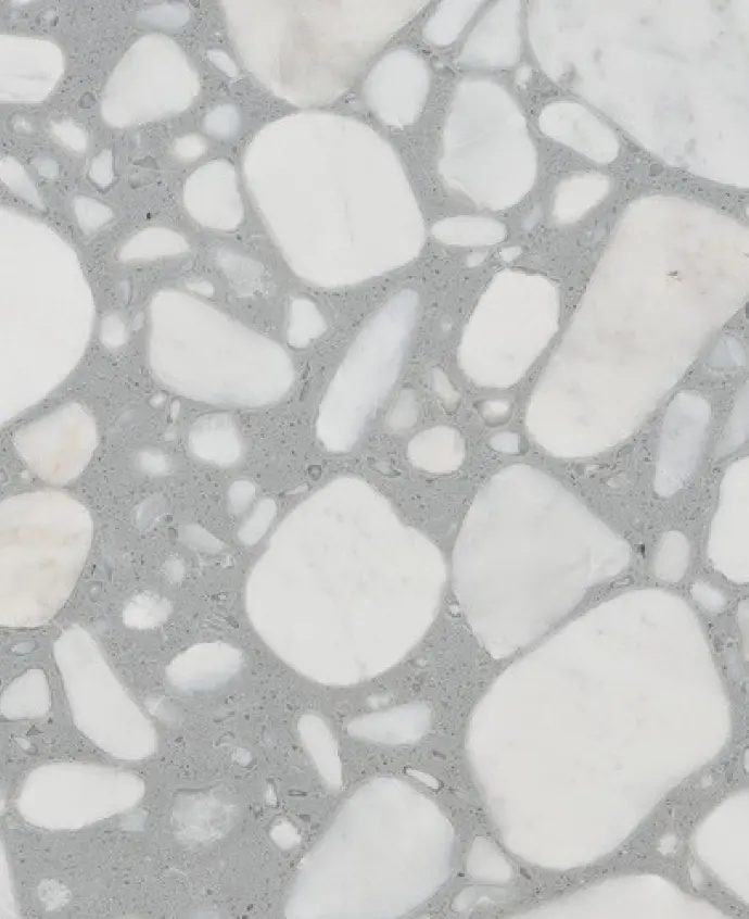 Terrazzo is a refined and durable surface made by blending natural marble chips with high-quality resins. It combines the timeless beauty of marble with the enhanced strength and reliability of quartz.