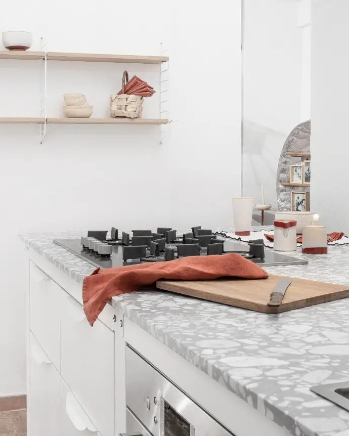 Terrazzo can withstand high temperatures in case of brief and occasional contact with hot foods or liquids. However, these surfaces are not heatproof; therefore, the use of coasters for hot pans is recommended.
